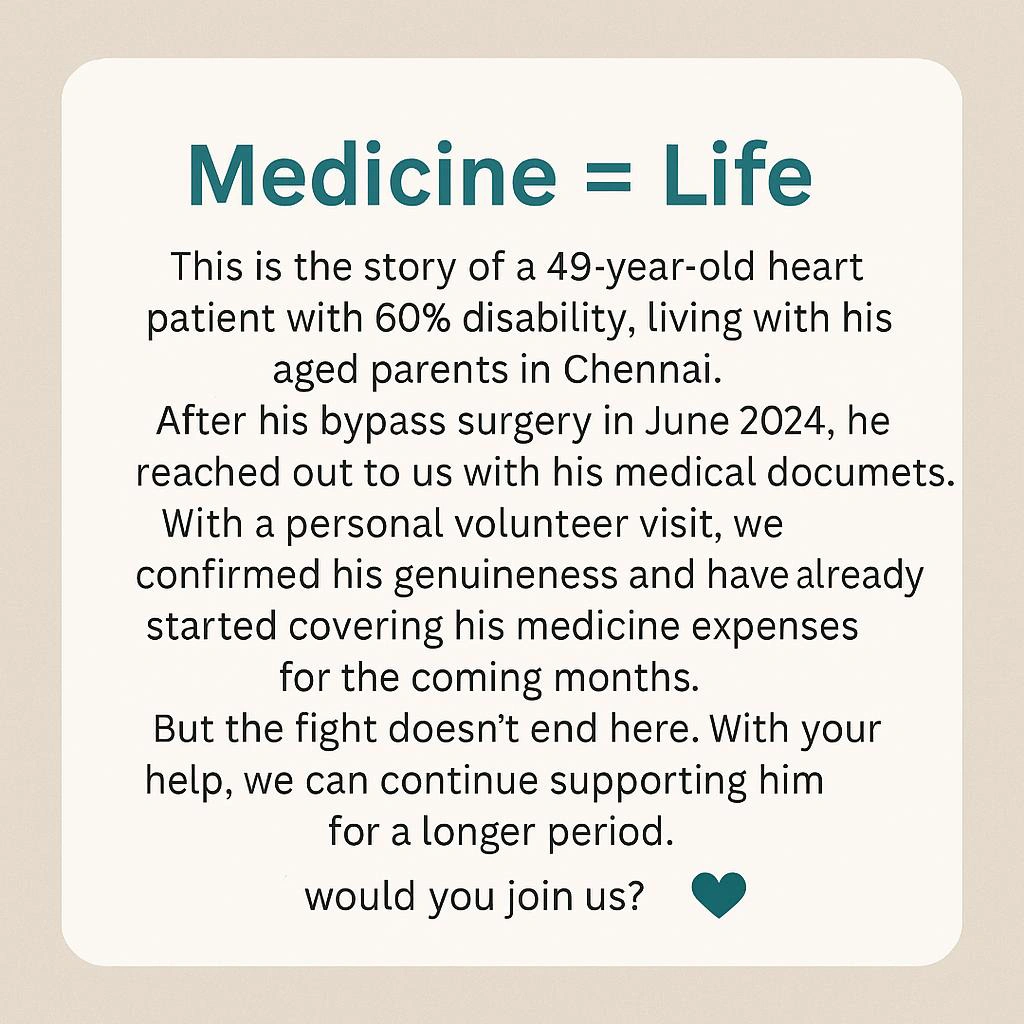 💊 Medicine = Life: A Story of Hope and Healing17 September 2025A 49-year-old man living in Chennai who is battling multiple challenges. At Arun Raj Foundation, we believe that health is not a privilege—it is a basic right. Recently, our team received a heartfelt request for support from a 49-year-old man living in Chennai who is battling multiple challenges.📖 His StoryDisability: 60% disability in his left legRecent Surgery: Heart bypass surgery at The Madras Medical Mission, Chennai on June 4, 2024Family Situation: Living with his elderly parents, with limited financial meansDocuments Submitted: Disability ID card, surgery discharge summary, medical prescriptionsDespite these challenges, he reached out to us with humility—requesting help with basic essentials like new clothes and life-saving medicines. 🌱 Our ResponseTo ensure complete transparency, one of our volunteers personally visited him to verify his situation and documents. His story was genuine, and his needs were urgent.We immediately committed to covering his medication expenses for the next few months. For someone recovering from major surgery, uninterrupted access to medicines is not just important—it’s the difference between life and risk. 🙌 How You Can HelpWhile we have stepped in to cover his immediate needs, the road ahead is long. His condition requires consistent medical care and ongoing support.🌱 With your contributions, we can extend this support beyond a few months and ensure his health and dignity are preserved.🎯 Why This MattersWhen we help one person, we are not just giving them medicine—we are restoring hope, relieving families, and proving that humanity still cares. Your donation, no matter how small, will directly go toward:Purchasing prescribed medicinesCovering essential post-surgery careSupporting individuals with verified disabilities🙏 Thanks from Receiver📜 மகிழ்ச்சியான செய்தியுடன் நன்றி கடிதம் – Arun Raj Foundation-க்கு அருண் ராஜ் பவுண்டேஷன், புதுக்கோட்டை அன்பிற்கினிய அருண் ராஜ் பவுண்டேஷன் குழுவிற்கு, வணக்கம்.எங்கள் குடும்பத்தின் சார்பாக, உங்கள் அமைப்பிற்கு எங்களது மனமார்ந்த நன்றியைத் தெரிவித்துக் கொள்கிறோம். சில நாட்களுக்கு முன், உங்கள் அமைப்பைத் தொடர்பு கொண்டு, மருத்துவ மாத்திரைகள் தொடர்பாக உதவி கேட்டிருந்தோம். அதற்கான பதிலாக, உளுந்தூர்பேட்டையில் வசிக்கும் உங்கள் நெருங்கிய நண்பர் ஒருவர், இன்று நேரில் வந்து, ஒரு மாதத்திற்கு தேவையான மாத்திரைகளை எங்களுக்கு வழங்கினார். அவர் மூன்று மாதத்திற்கான மாத்திரைகள் வழங்கப்படும் என கூறியிருந்தார். தற்போது ஒரு மாதத்திற்கானவை வழங்கப்பட்டுள்ளன, மேலும் மீதமுள்ள மாத்திரைகள், அவை தீர்ந்தவுடன் வழங்கப்படும் என அவர் உறுதியுடன் கூறினார். இந்த உதவி எங்களுக்கு மிகுந்த நிம்மதியும் நம்பிக்கையும் அளிக்கிறது. உங்கள் அமைப்பின் இந்த மனிதநேய செயல் எங்களது மனதை நெகிழச் செய்தது. உங்கள் நண்பரின் நேரடி வருகையும், மருந்துகளை வழங்கிய விதமும் எங்களுக்கு மிகுந்த மகிழ்ச்சியை ஏற்படுத்தியது. இந்த மகிழ்ச்சியான செய்தியை உங்களுடன் பகிர்வதில் பெருமிதம் கொள்கிறோம். உங்கள் அமைப்பின் சேவை மேலும் பலருக்கு நன்மை பயக்க வேண்டும் என்பதே எங்கள் மனமார்ந்த விருப்பம். உங்கள் அருமையான உதவிக்கு எங்களது நன்றியைத் தெரிவித்துக் கொண்டு, உங்கள் அமைப்பின் அனைத்து உறுப்பினர்களுக்கும் எங்கள் அன்பும், நன்றியும், வாழ்த்துகளும் உரித்தாகும். மரியாதையுடன்,R. சசிகுமார் மற்றும் குடும்பம்🤝 Join Us in This MissionAt Arun Raj Foundation, every campaign is personal. We don’t just respond to emails—we listen, we visit, we verify, and we stand by those in need.Together, we can make sure that no one is left struggling for basic healthcare. ✨ A small donation = a big heartbeat saved. #image_title #image_title #image_title #image_title Share: