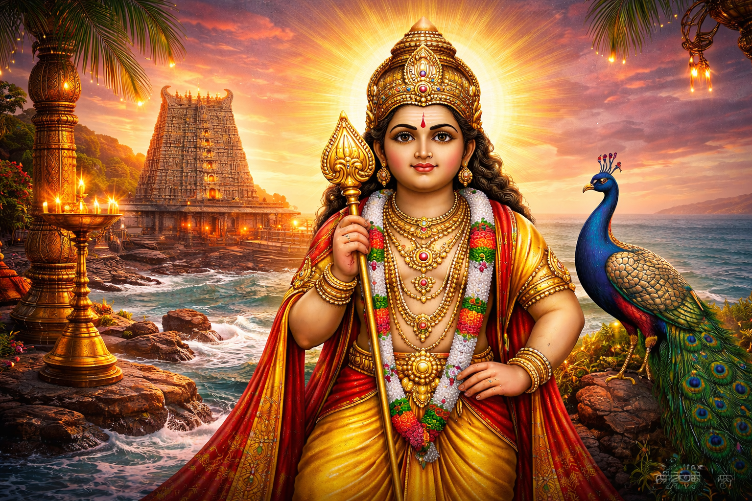 • 🙏 Residing at Thiruchendur by the pearl-filled sea, Murugan stands as the cherished Lord of the celestials, offering refuge and liberation to all who surrender.