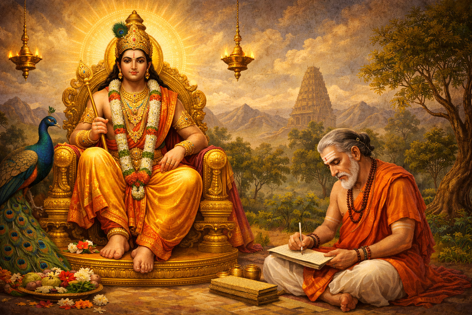 Thiruppugazh 86 Manaththin Pangku (Thiruchchendhur) Thiruppugazh 86 Manaththin Pangku (Thiruchchendhur) திருப்புகழ் 86 மனத்தின் பங்கு மனத்தின்பங் கெனத்தங்கைம் புலத்தென்றன் குணத்தஞ்சிந் த்ரியத்தம்பந் தனைச்சிந்தும் …… படிகாலன்மலர்ச்செங்கண் கனற்பொங்குந் திறத்தின்தண் டெடுத்தண்டங் கிழித்தின்றிங் குறத்தங்கும் …… பலவோரும்எனக்கென்றிங் குனக்கென்றங் கினத்தின்கண் கணக்கென்றென் றிளைத்தன்புங் கெடுத்தங்கங் …… கழிவாமுன்இசைக்குஞ்செந் தமிழ்க்கொண்டங் கிரக்கும்புன் றொழிற்பங்கங் கெடத்துன்பங் கழித்தின்பந் …… தருவாயேகனைக்குந்தண் கடற்சங்கங் கரத்தின்கண் தரித்தெங்குங் கலக்கஞ்சிந் திடக்கண்துஞ் …… சிடுமாலும்கதித்தொண்பங் கயத்தன்பண் பனைத்துங்குன் றிடச்சந்தங் களிக்குஞ்சம் புவுக்குஞ்செம் …… பொருளீவாய்தினைக்குன்றந் தனிற்றங்குஞ் சிறுப்பெண்குங் குமக்கும்பந் திருச்செம்பொன் புயத்தென்றும் …… புனைவோனேசெழிக்குங்குண் டகழ்ச்சங்கங் கொழிக்குஞ்சந் தனத்தின்பைம் பொழிற்றண்செந் திலிற்றங்கும் …… பெருமாளே. சொல் விளக்கம் மனத்தின் பங்கெனத் தங்கு ஐம்புலத்தென்றன் குணத்து அஞ்சு இந்த்ரியத்தம்பந் தனை சிந்தும் படிகாலன் மலர்ச்செங்கண் கனற்பொங்கும் திறத்தின்தண்டு எடுத்து அண்டங் கிழித்தின்றிங்குற: 🙏 மனம் செல்லும் பல்வேறு வாயில்களாகிய ஐம்புலன்களில் சிக்கியுள்ள என் குணங்களும், அவற்றைத் தாங்கி நிற்கும் இவ்வுடலும், யமனின் தண்டாயுதம் எழும்பும் வேளையில் சிதறிப் போகத் தயாராகின்றன என்பதை உணர்த்துகிறது. ⚡ மலர்போன்ற செங்கண்களில் நெருப்பு பொங்க, ஆகாயத்தைப் பிளந்துகொண்டு வருகிற காலன், உடலின் நிலையின்மையையும் வாழ்க்கையின் மாயத்தன்மையையும் நினைவூட்டுகின்றான். தங்கும் பலவோரும் எனக்கென்று இங்கு உனக்கென்று அங்கு இனத்தின்கண் கணக்கென்றென்று இளைத்தன்புங் கெடுத்து அங்கம் கழிவாமுன்: 🏠 குடும்பத்தார் சொத்து பங்கீடு செய்து ‘இது எனக்கு, அது உனக்கு’ எனப் பிரிவினை பேசிக்கொண்டிருக்கும் நிலையையும், அன்பு சுருங்கி உடல் அழியும் முன்பே உறவுகள் சிதைவதையும் அருணகிரிநாதர் வெளிப்படுத்துகிறார். 💔 உலக வாழ்க்கையின் நிலையற்ற தன்மையால் மனிதன் சோர்ந்து போகும் தருணத்தை இவ்வடிகள் வெளிப்படையாகச் சித்தரிக்கின்றன. இசைக்குஞ்செந்தமிழ்க்கொண்டு அங்கிரக்கும்புன் றொழிற்பங்கம் கெட துன்பங் கழித்தின்பந் தருவாயே: 📜 புகழ் வாய்ந்த செந்தமிழால் உன்னைப் பாடி, பிறரிடம் யாசிக்கும் இழிதொழில் நீங்கி, துன்பம் அகன்று ஆனந்தம் கிடைக்க அருள் வேண்டுதல் இங்கு வெளிப்படுகிறது. 🌺 பக்தியின் வழியே துன்பத்தைத் தொலைத்து, பரம இன்பத்தை அருள்வாயாக என்ற ஆழ்ந்த விண்ணப்பம் இவ்வரிகளில் நிறைந்துள்ளது. கனைக்குந்தண் கடற்சங்கம் 